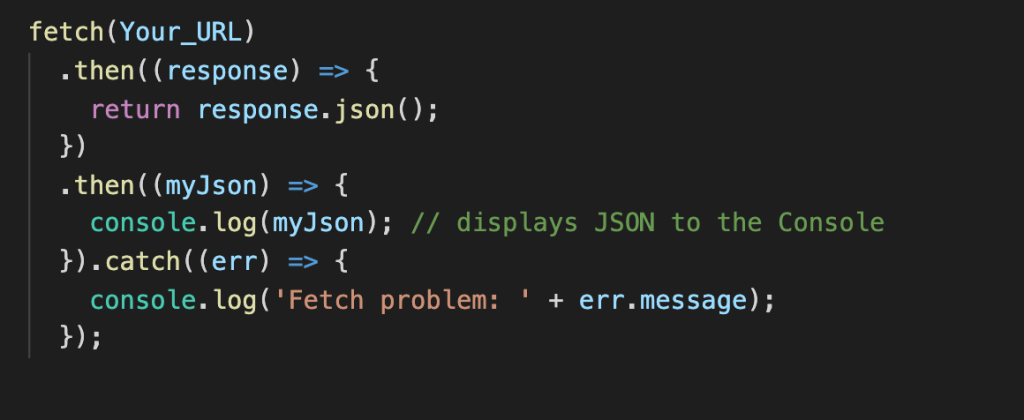 Fetch has a total of five main methods GET, POST, PATCH, PUT, DELETE, and HEAD, I will be covering five of them (GET, POST, PUT, PATCH, and DELETE). Fetch actually only returns a promise so we must use a special function called “then” that waits for a promise to get fulfilled and then the “then” function can be used to return the data or to be used in a different ways. First and most simple is the GET method which is formatted like this.