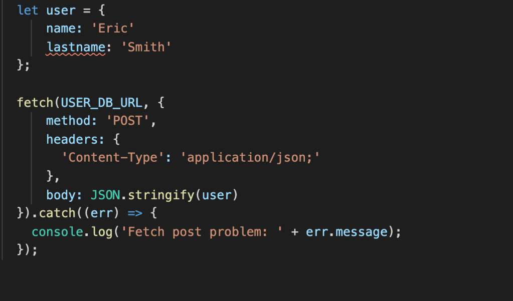 As you can see this function simply makes a request to a URL then once that promise is fulfilled returns the data in JSON form then console logs that data. Then the catch is always a good idea to handle errors so you know what error you ran into. The Second method I will talk about is POST, this is when you a create new data to send and be saved to the database or file. This follows the format of first declaring the fetch and the URL then inside the fetch you must specify the method type (POST), headers, and body. So for example if you had a database full of users you could create a user like so.