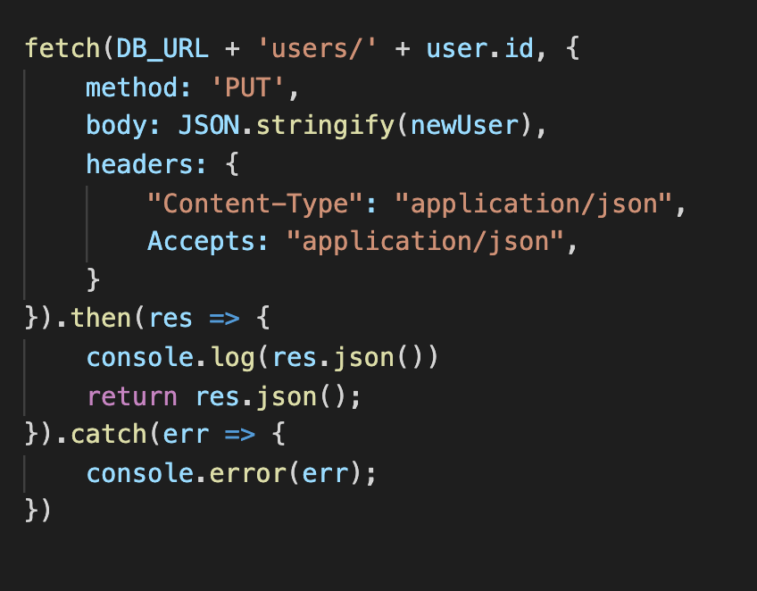 The content type in the header specifies what the media type is that is being sent to the server, in this case JSON. Next the body is just the data itself that is being sent in this case we formate it with JSON.stringify to properly input it into the database. The next method is PUT which is similar to POST method but is used to update an existing resource rather than creating a new one, here is an example of a PUT.