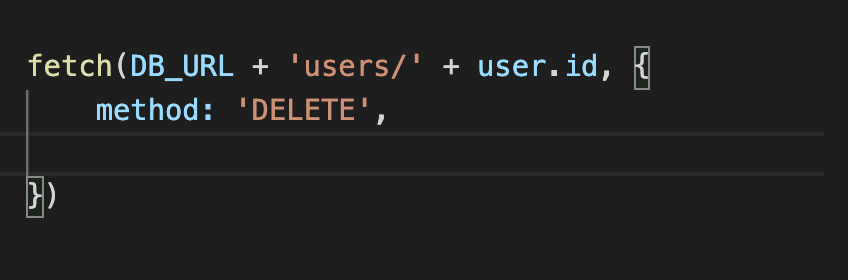 As you can see PUT is very similar to POST but the URL it goes to is slightly changed to be the exact content in the database you are trying to change. An even more similar fetch method is PATCH, which is exactly the same as PUT but with two exceptions method: ‘PATCH’ obviously, and the data being passed in does not need to be a whole user object (or whatever table in your db you’re trying to change). It can just be the key value pairs of the objects fields you are trying to change. Example