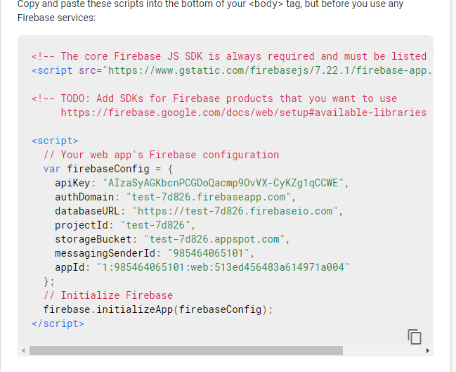 First go to https://console.firebase.google.com/ (sign into gmail) then click Add project, then name the project. Decide whether you want google analytics that’s up to you on a case by case basis, if you are developing a larger scale app you might like some of these features. Then once your project is created, you will be brought to the firebase overview page and you will see in the middle a git started by creating an app click on one of the three options and register your app. This will then present you with an SDK code snippet to link your app to firebase.
