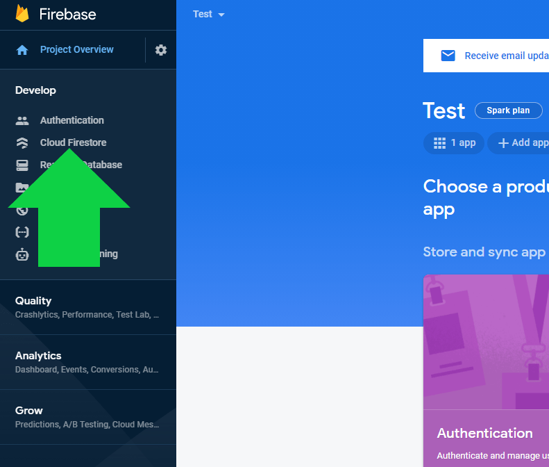 After which continue to the console you will see a taskbar on the left side from there click Develop then click Cloud Firestore.